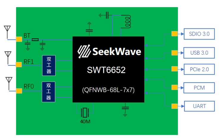 SWT6652系列芯片支持多种连接接口,包括PCIe、USB3.0、USB2.0、SDIO3.0以及高速UART,同时支持PCM和IIS接口用于音频数据传输。
